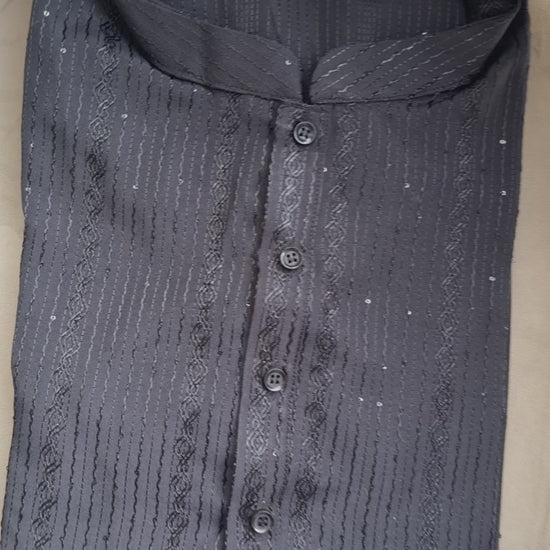 The kurta features a refined black hue with subtle texture, complemented by a mandarin collar and a clean button placket for a structured, modern silhouette. Paired with a coordinated pyjama, the set ensures ease of movement while maintaining a polished ethnic look.