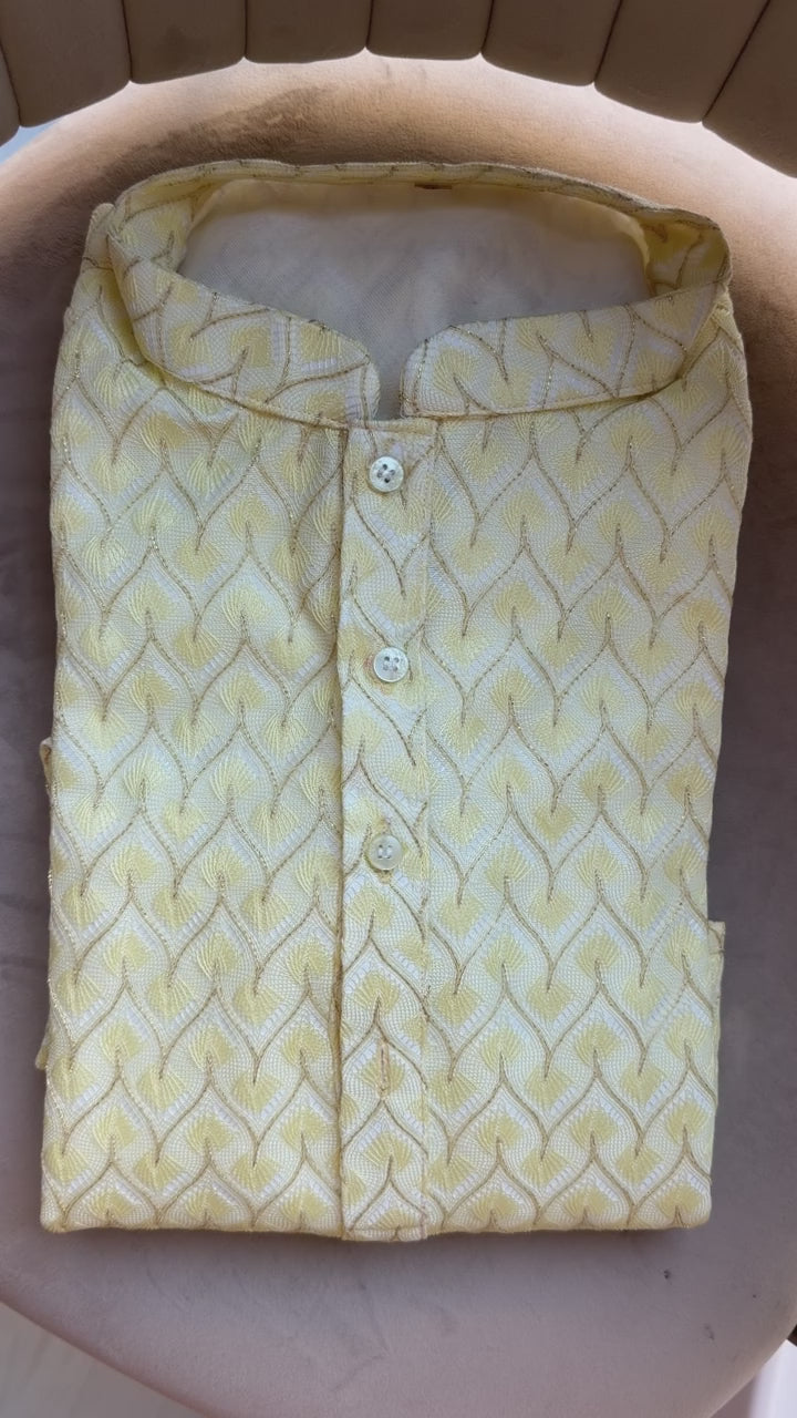 Ideal for daytime festivities, weddings, and celebratory occasions, this lemon jacquard kurta pyjama set brings together modern elegance and traditional craftsmanship.