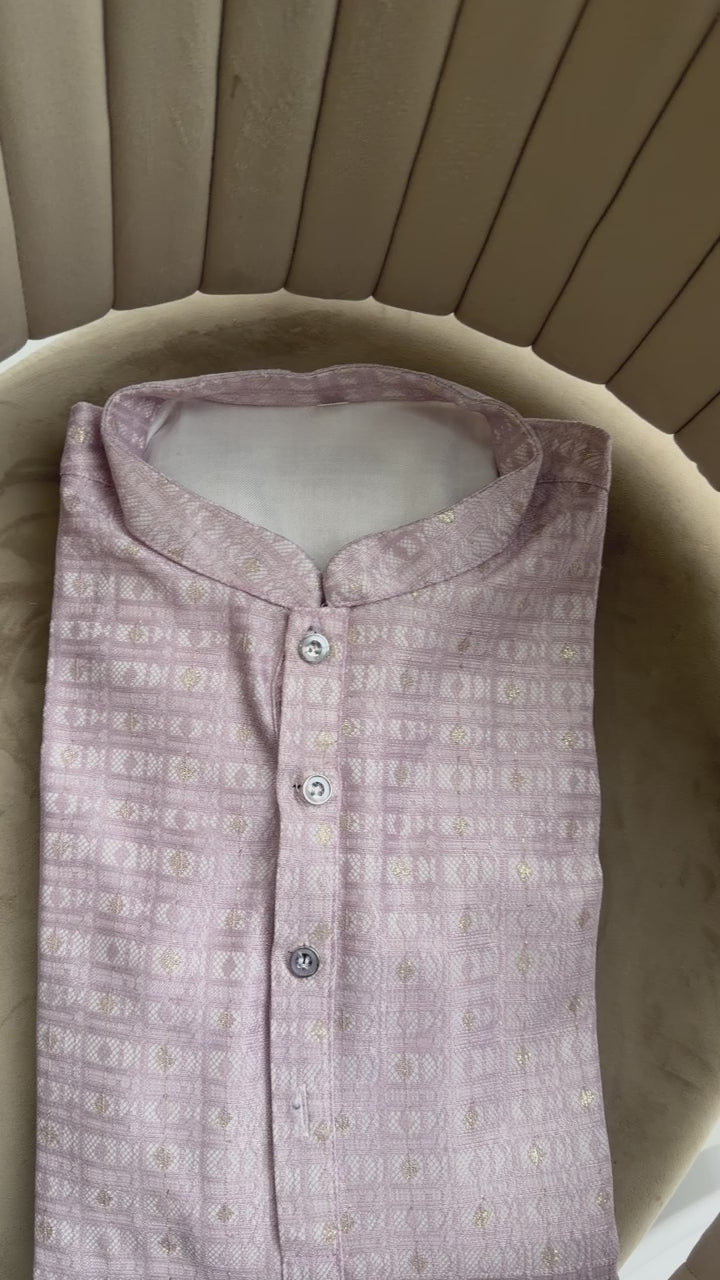 Perfect for weddings, festive occasions, and special events, this dusty lavender jacquard kurta pyjama set blends contemporary elegance with traditional appeal.