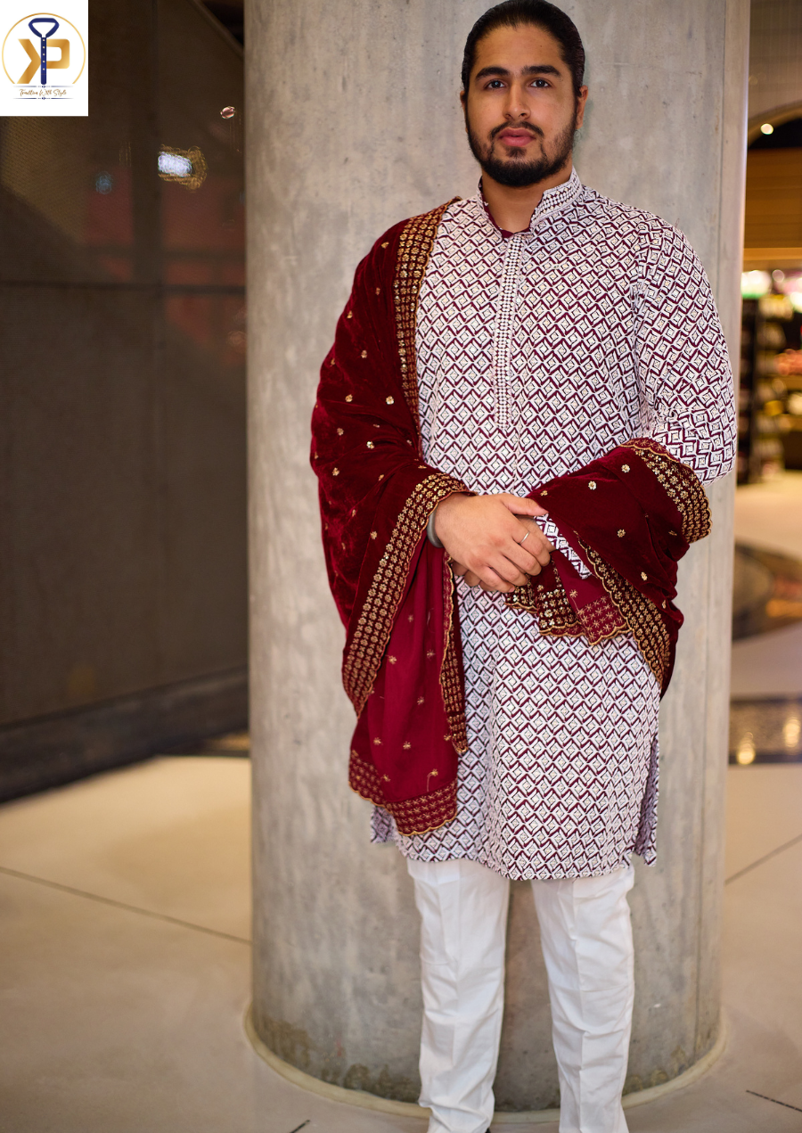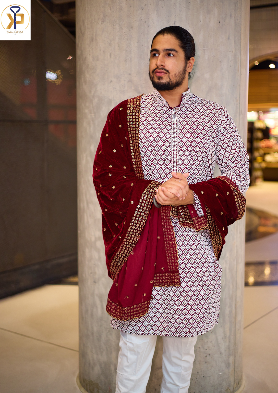 Elevate your formal attire with this luxurious velvet maroon shawl designed specifically for men. The rich maroon hue and premium velvet texture add sophistication to traditional outfits while providing warmth and comfort. Perfect for special occasions, weddings, or cultural celebrations where refined elegance is essential.